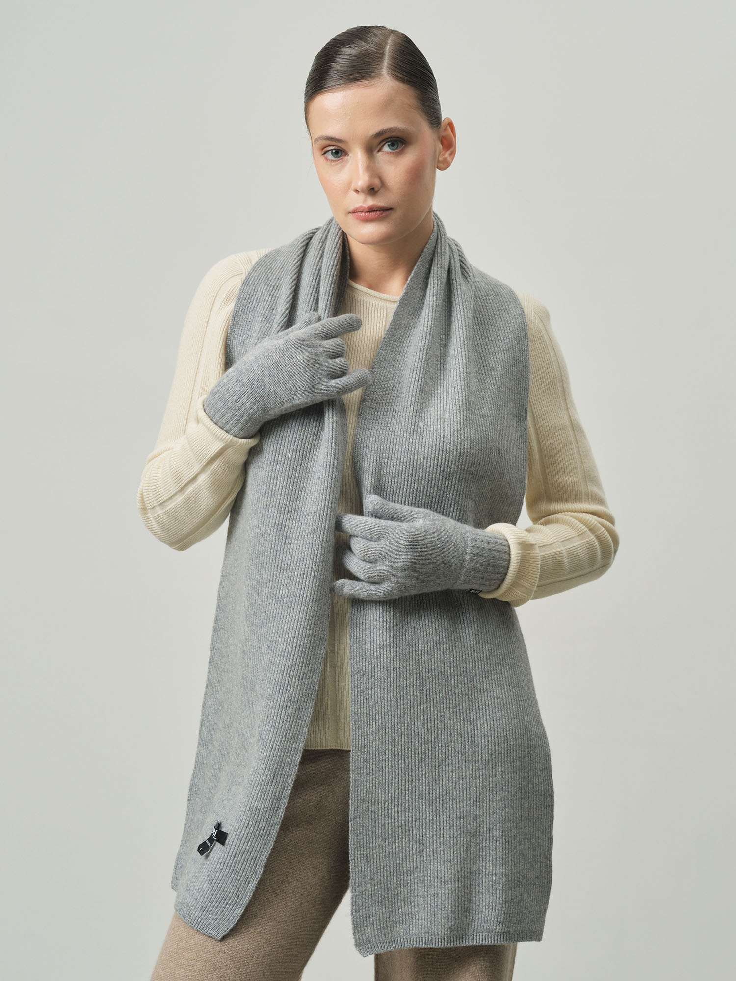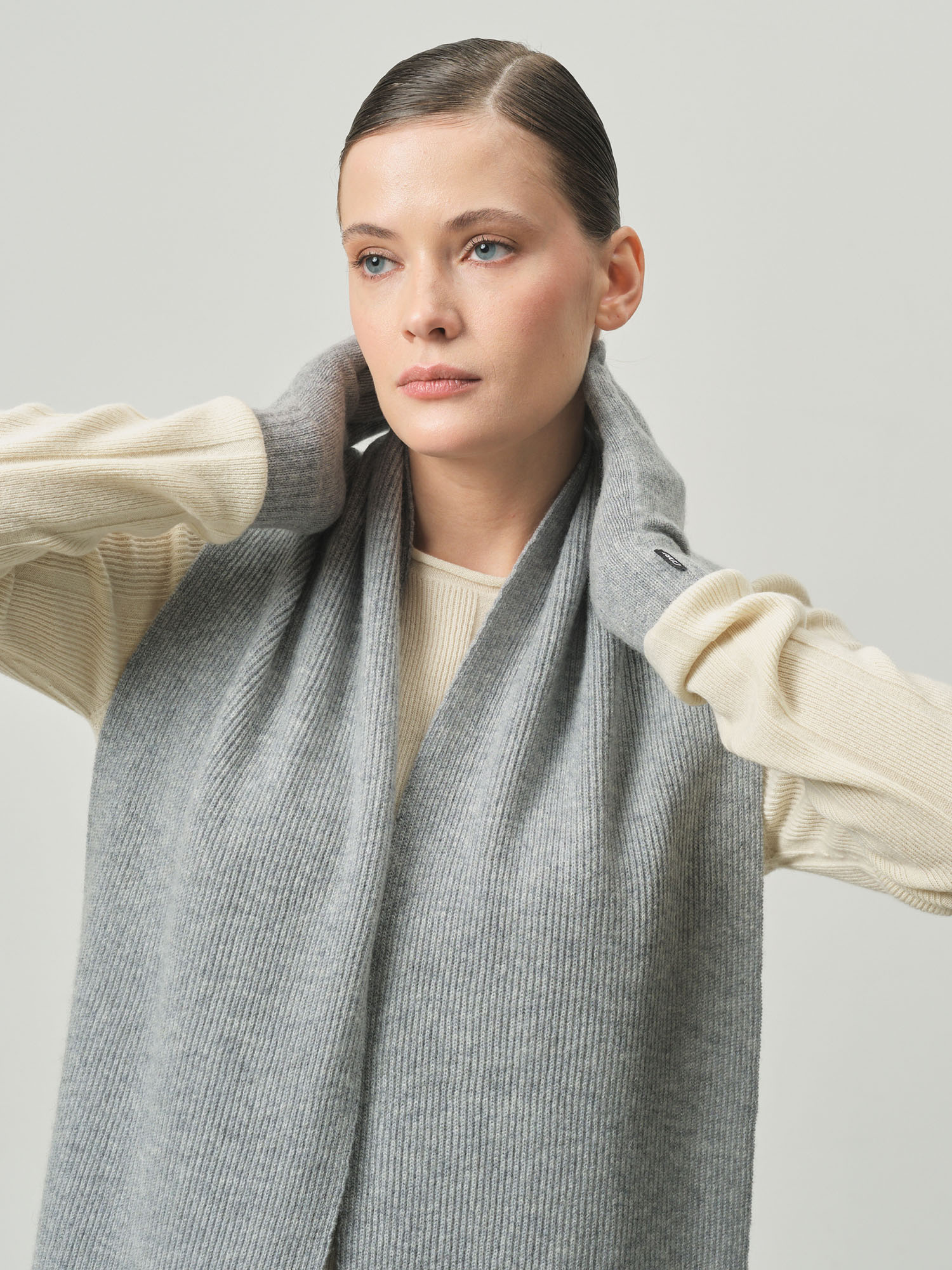 Классическая прямоугольная форма с фактурной вязкой в рубчик. Минималистичный дизайн подчёркивает благородную текстуру кашемира и делает шарф универсальным аксессуаром для разных стилей.