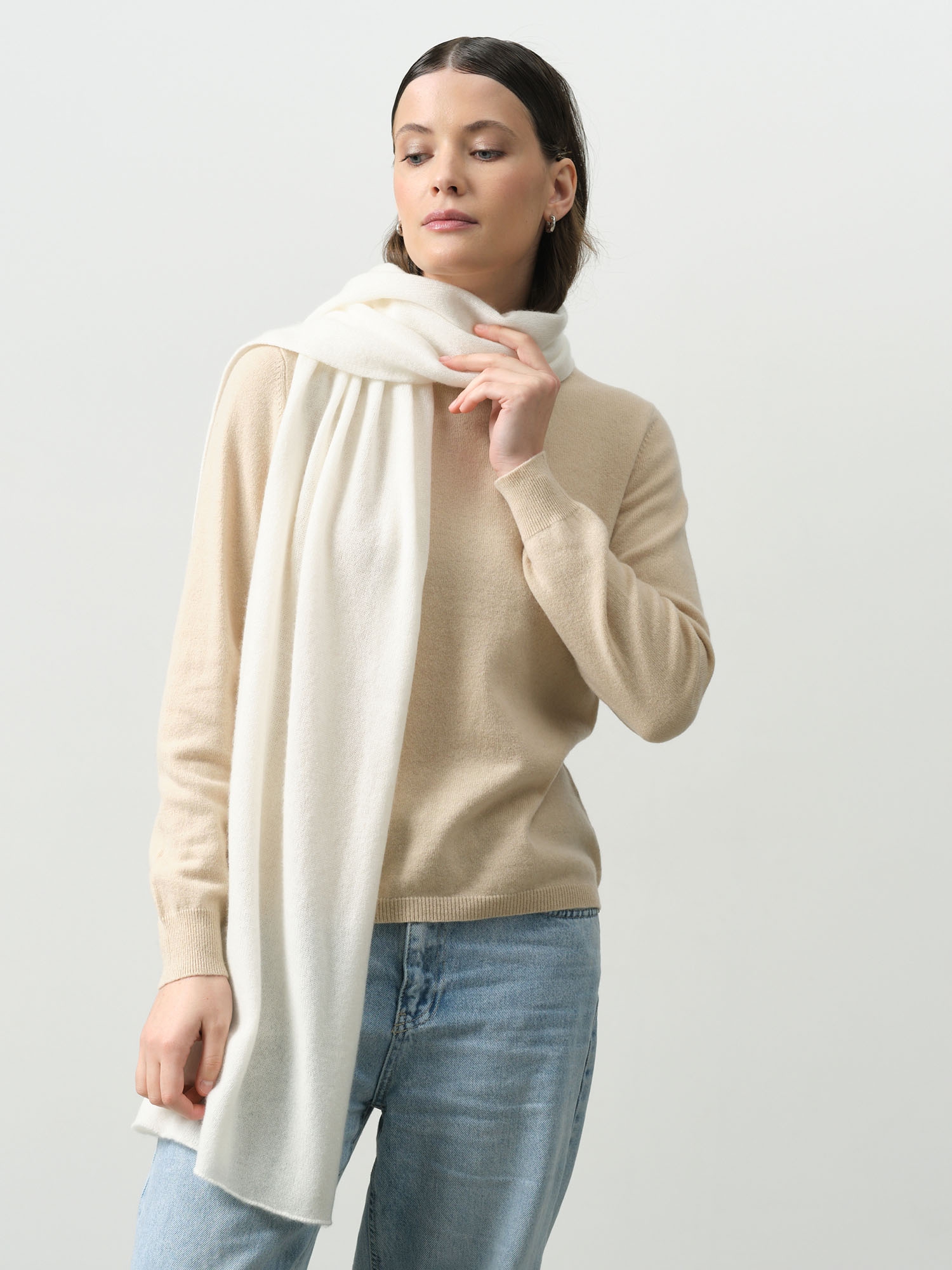 Шарф из 100% кашемира, очень мягкий и приятный на ощупь. Фото на сайте полностью соответствуют действительности. Белый цвет благородный, не желтит. |