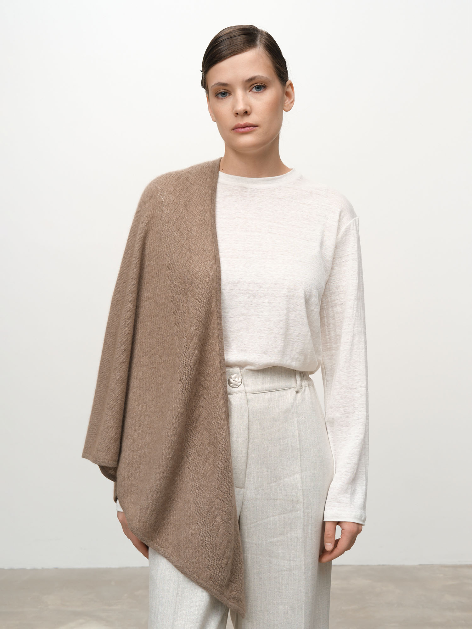 100% кашемир. Натуральный кашемир отличается исключительной мягкостью, лёгкостью и высокими теплоизоляционными свойствами. Материал приятен к коже, деликатно согревает и обеспечивает комфорт при носке.