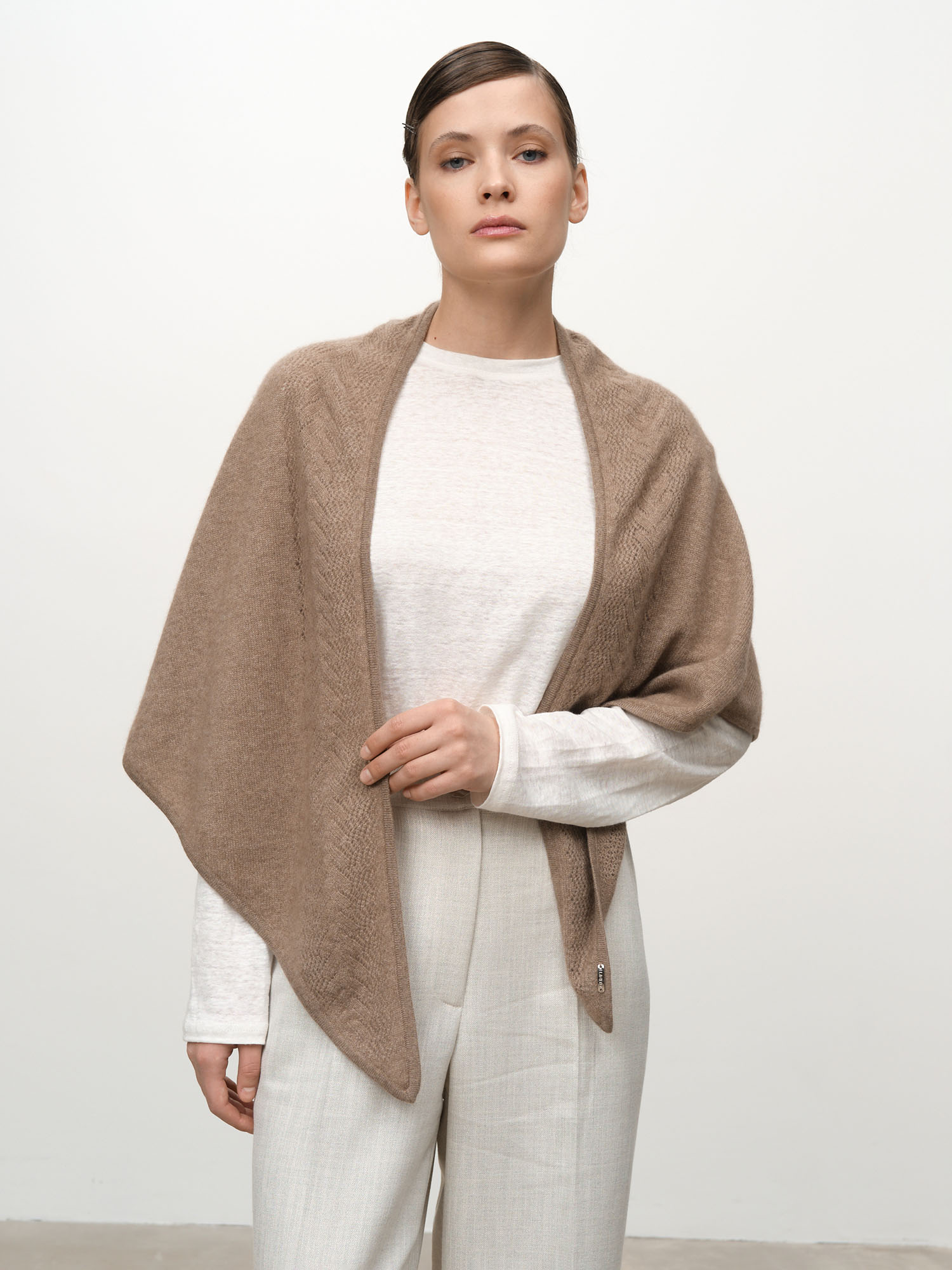 Модель выполнена в аккуратной треугольной форме, которая позволяет красиво драпировать аксессуар. Минималистичный дизайн подчёркивает благородную фактуру кашемира и делает изделие универсальным элементом гардероба.