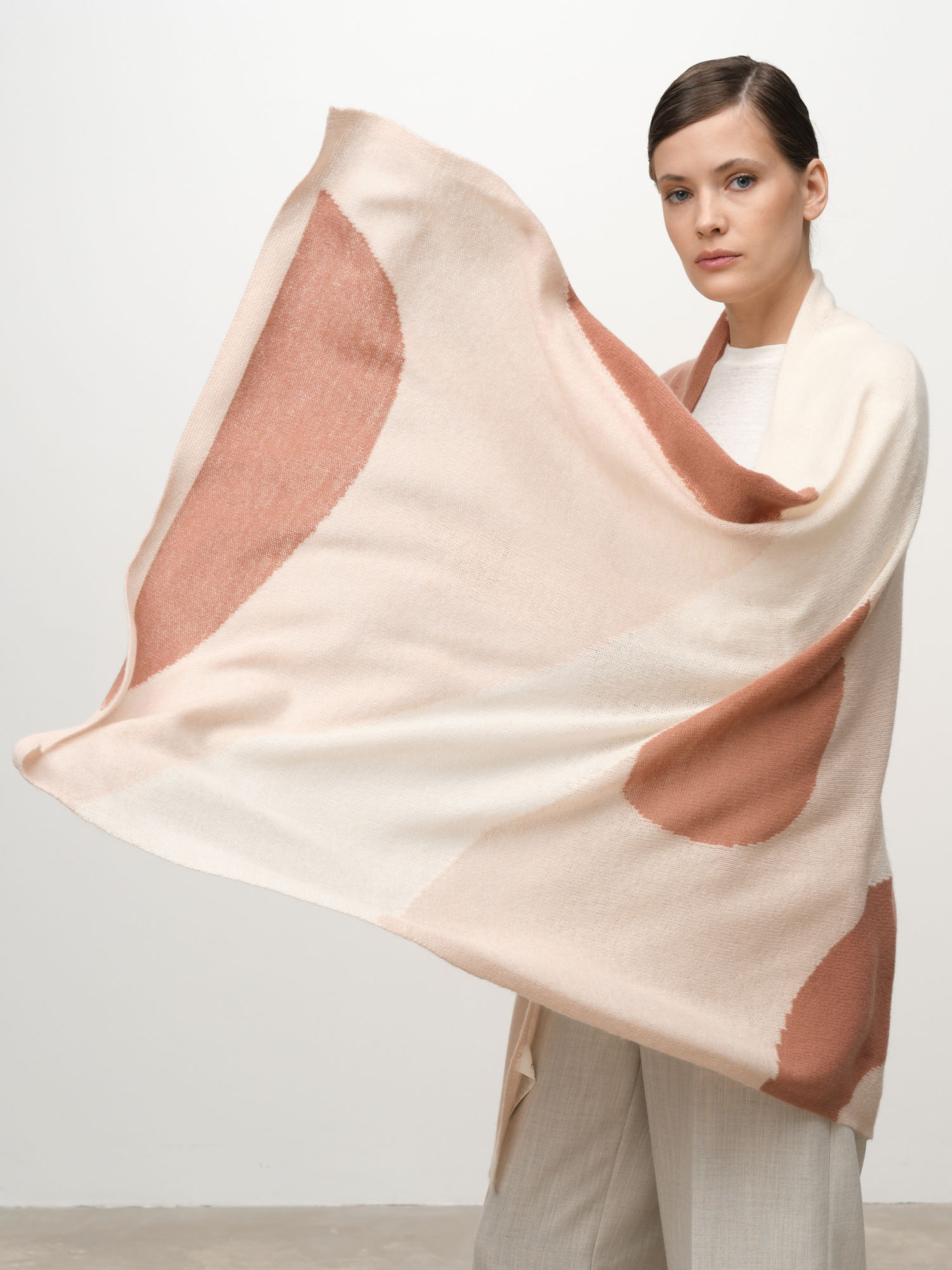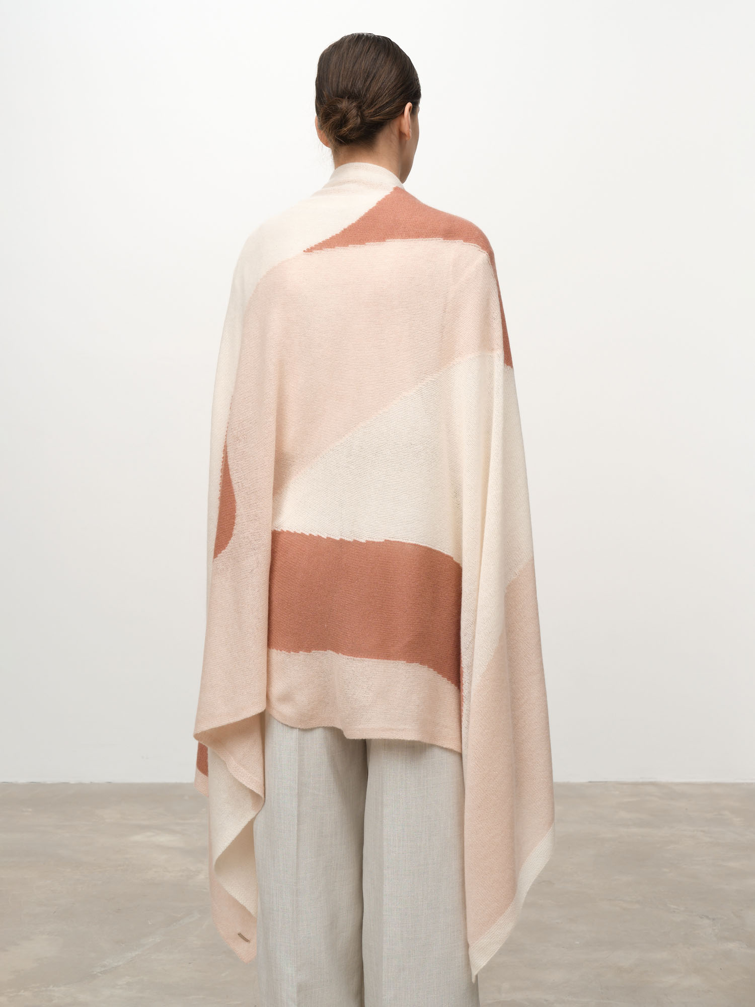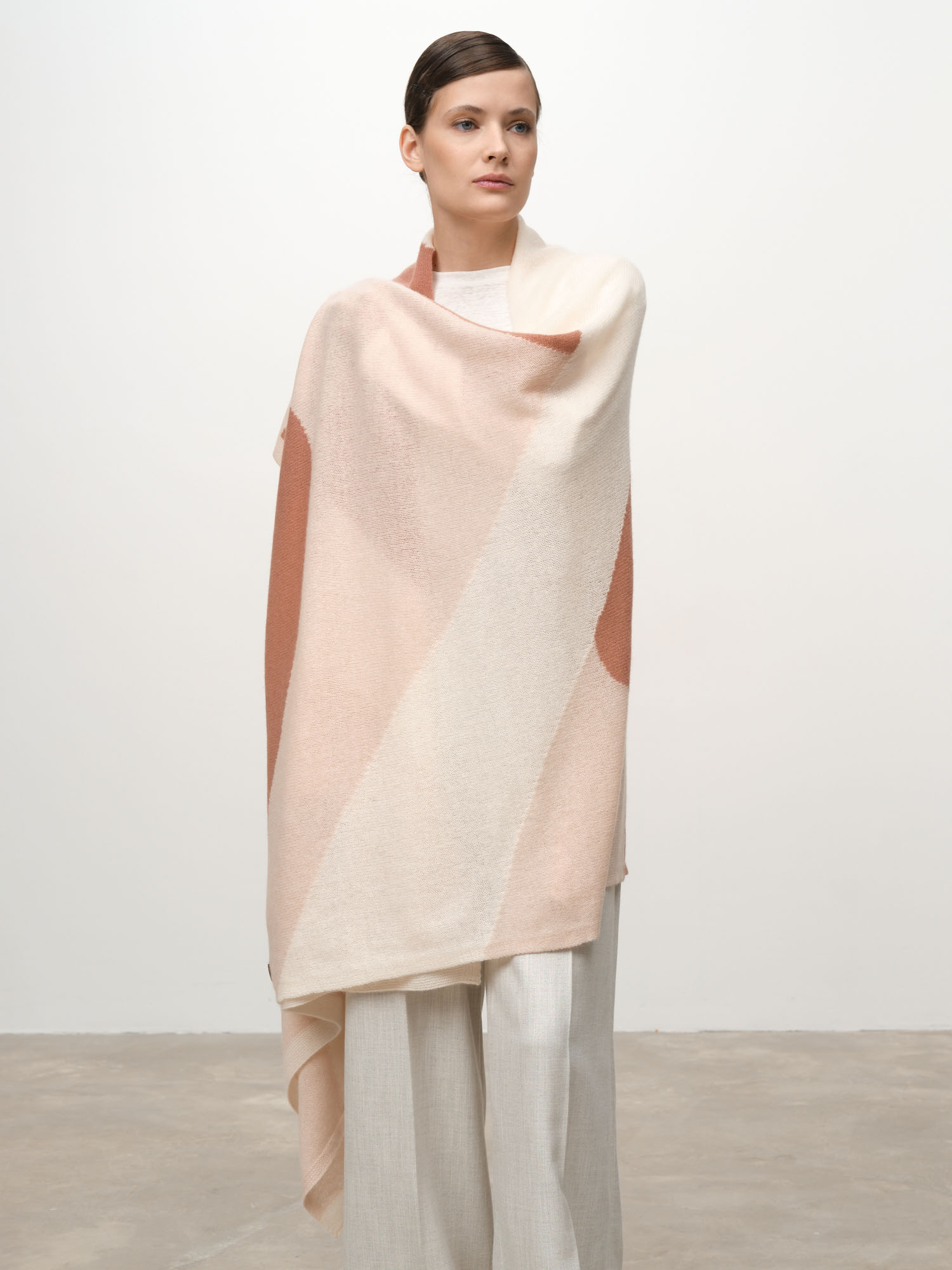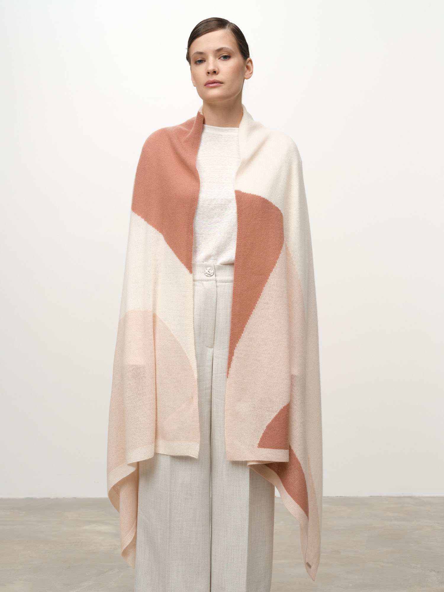 Модель выполнена в формате широкого палантина с современным геометрическим рисунком. Мягкая фактура и плавные линии цветовых блоков создают стильный и выразительный визуальный эффект.