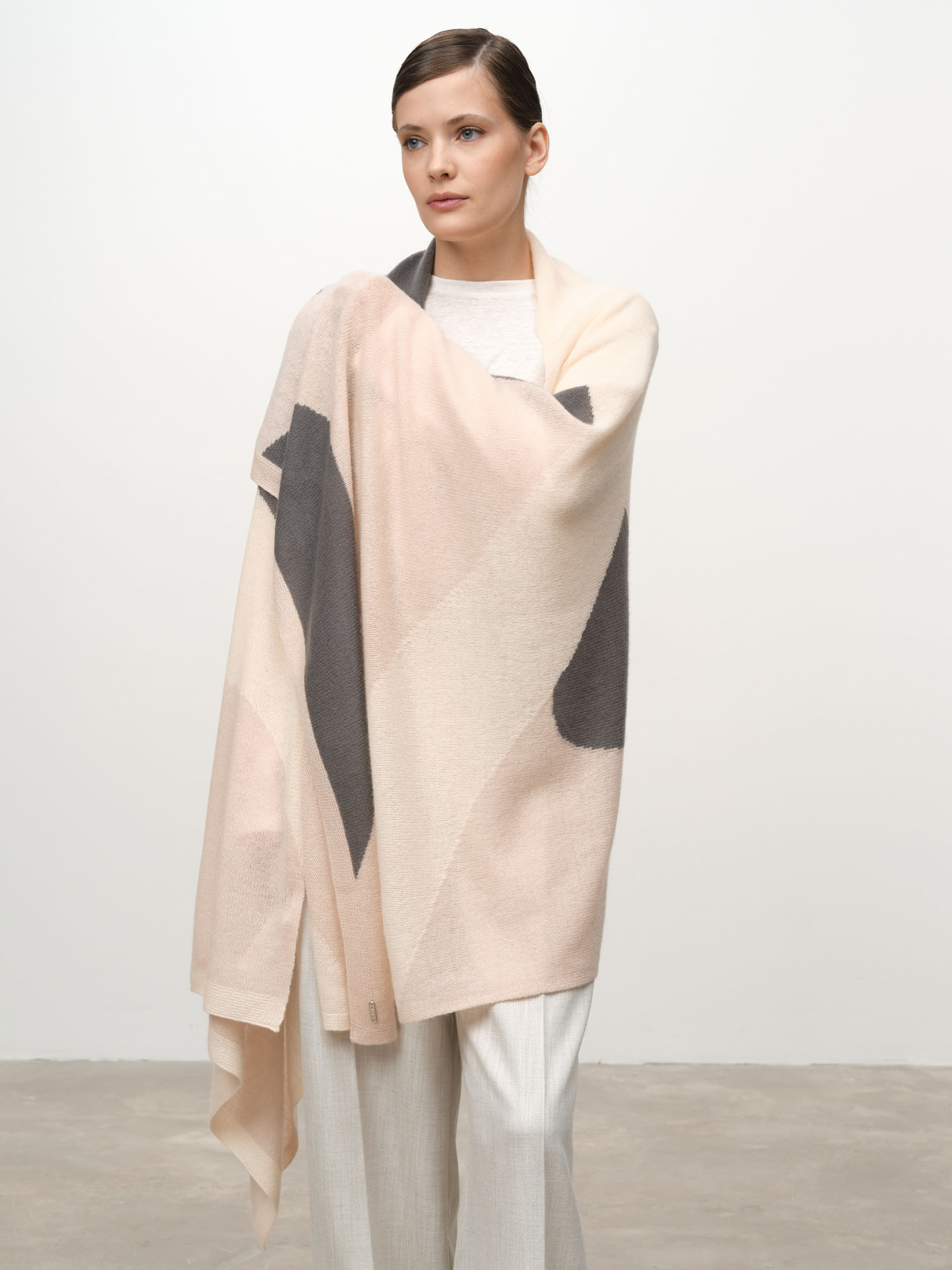 Модель выполнена в формате широкого палантина с лаконичным минималистичным рисунком. Контрастные декоративные элементы создают современный графичный эффект и подчёркивают стиль изделия.