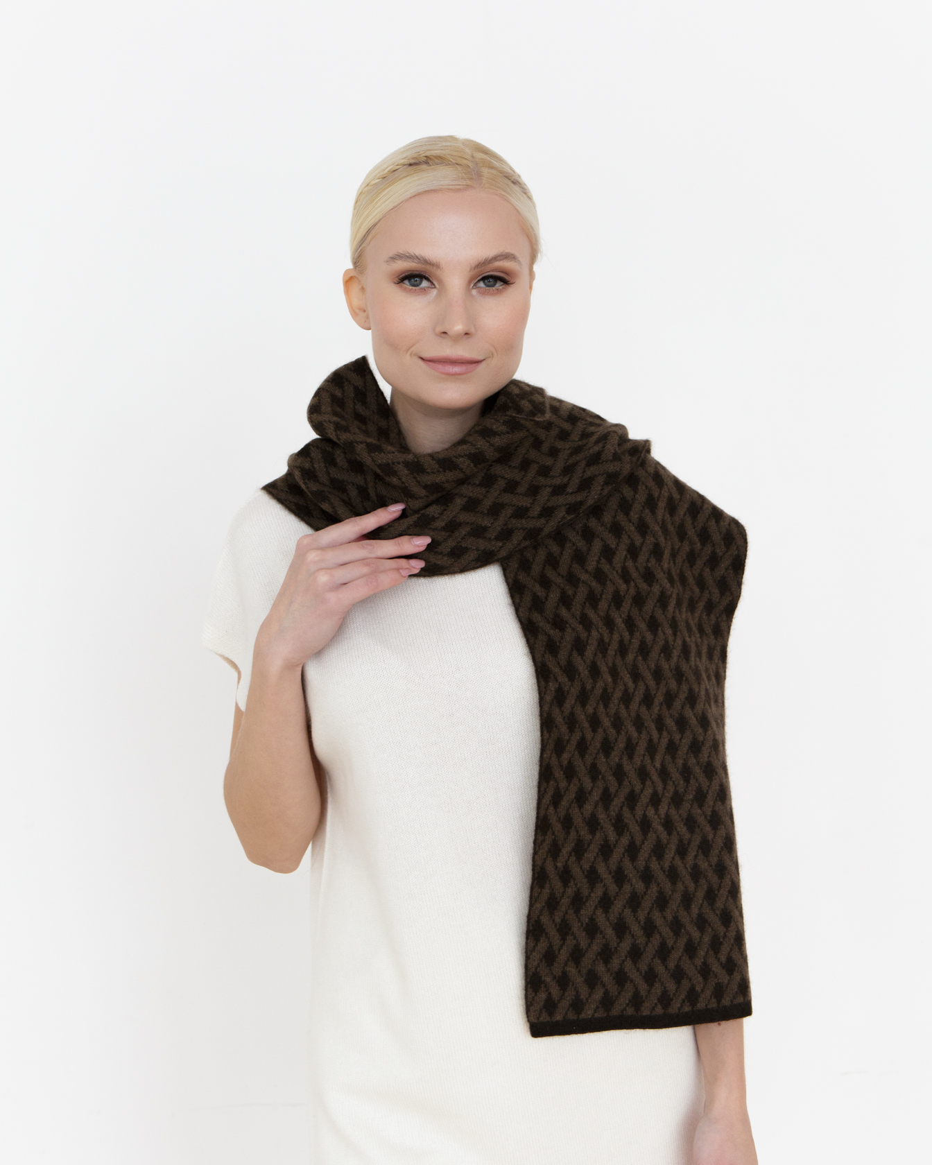 Темно-коричневый с контрастным бежевым узором — благородное сочетание натуральных оттенков, которое легко комбинируется с базовой палитрой гардероба.