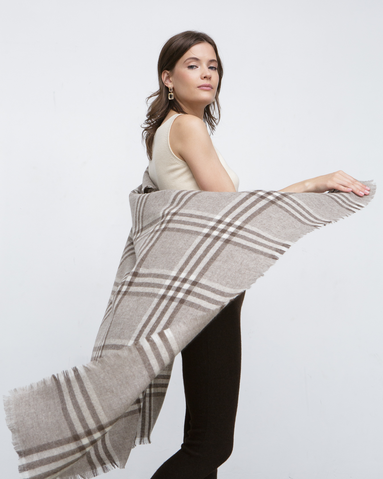 Сочетание бежевых, серых и коричневых оттенков в классическом клетчатом рисунке, которое легко комбинируется с базовыми цветами гардероба.
