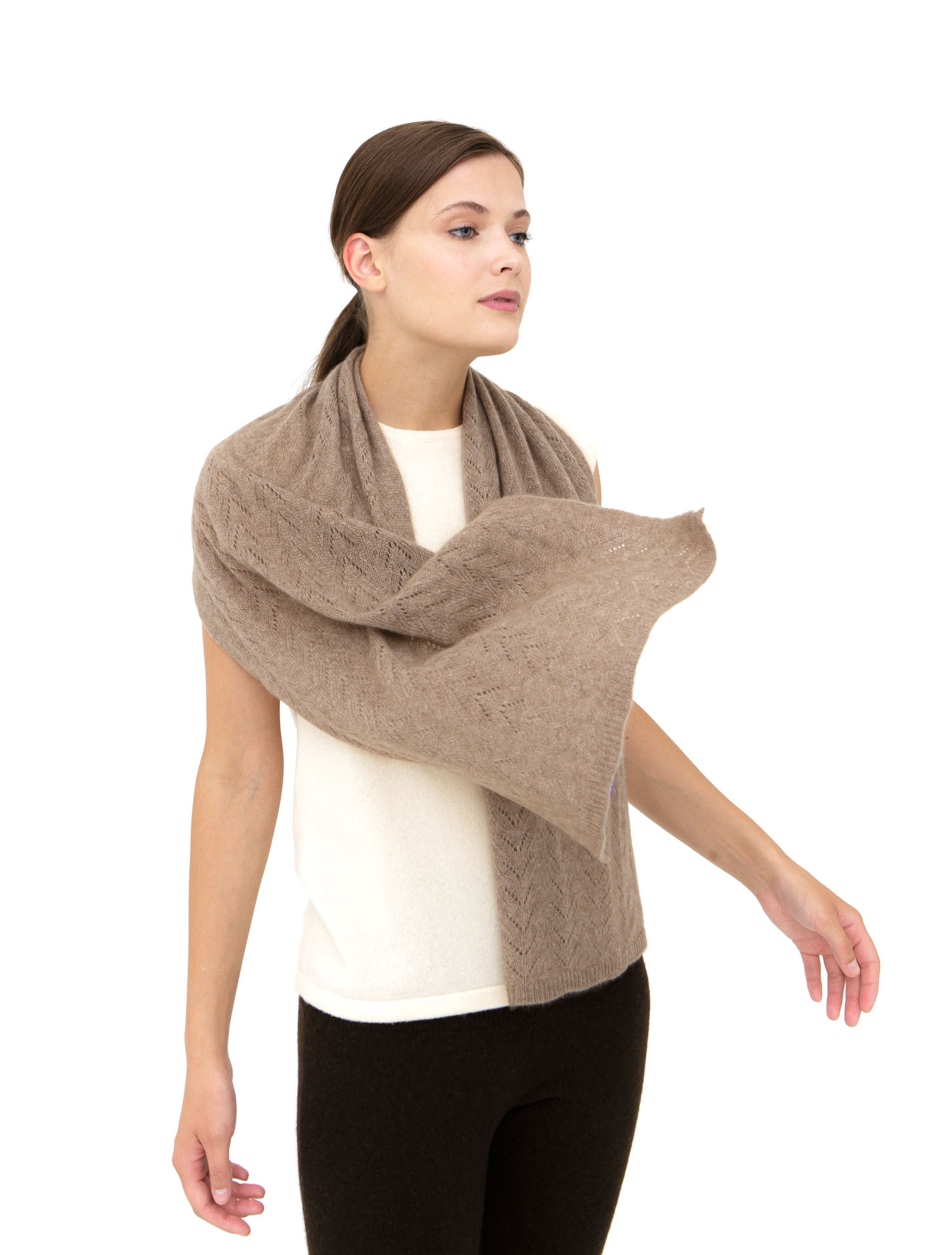 Модель выполнена в классической прямоугольной форме с мягкой фактурной вязкой. Минималистичный дизайн подчёркивает благородную текстуру кашемира и делает аксессуар универсальным для различных образов.