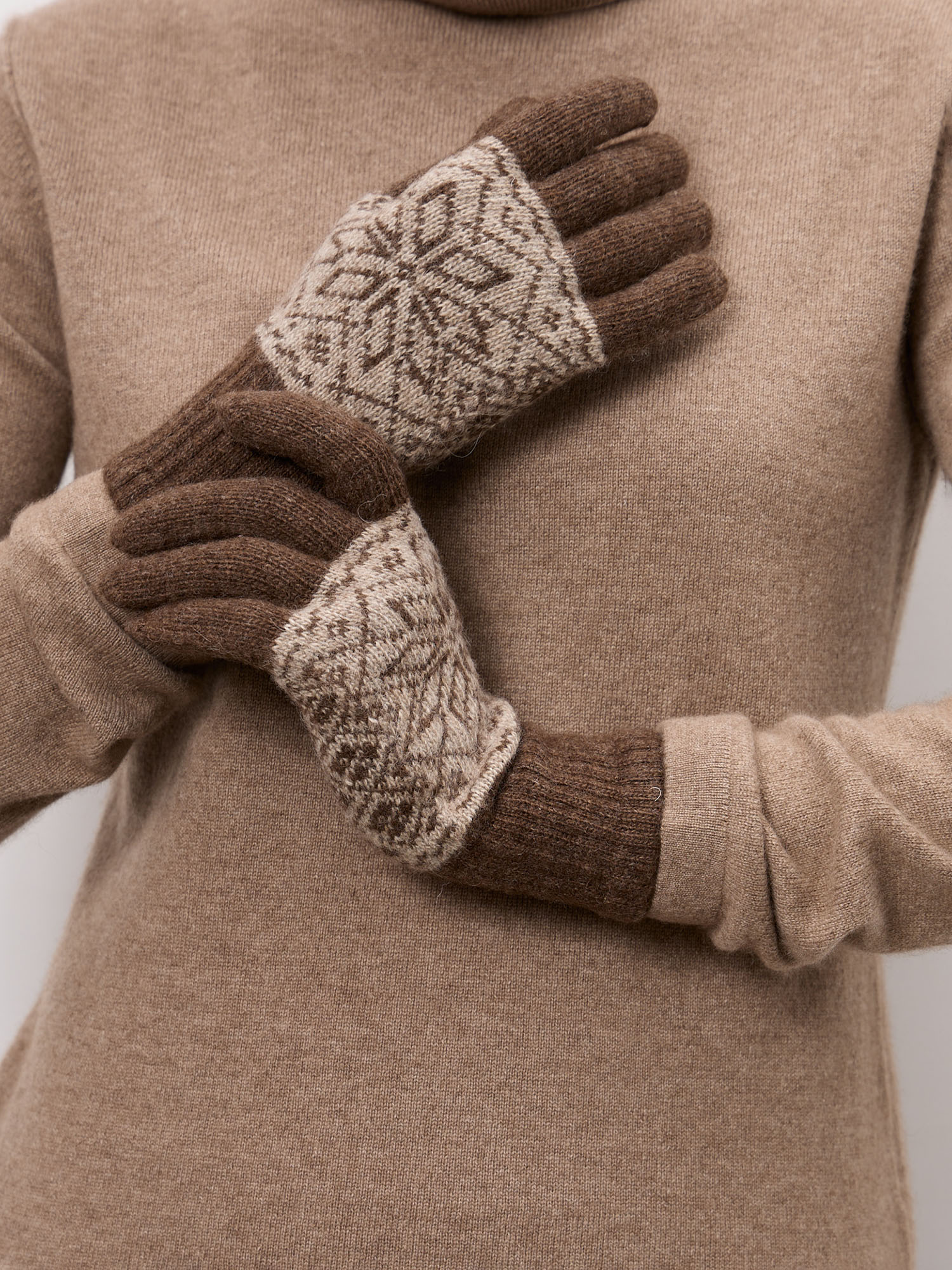 Тёплые шерстяные перчатки с декоративным рисунком — это стильное и практичное решение для холодного времени года. Модель сочетает комфорт, тепло и выразительный дизайн: контрастные вставки с орнаментом создают эффектный внешний вид и делают аксессуар акцентом зимнего образа.