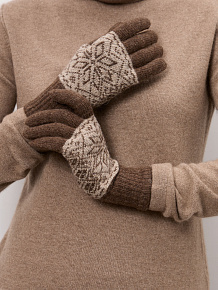 Модель выполнена с акцентом на контрастные узорные элементы: геометрические и снежинообразные орнаменты в этно-стиле. Сочетание разных оттенков и рисунков придаёт перчаткам оригинальность и делает их стильным аксессуаром.