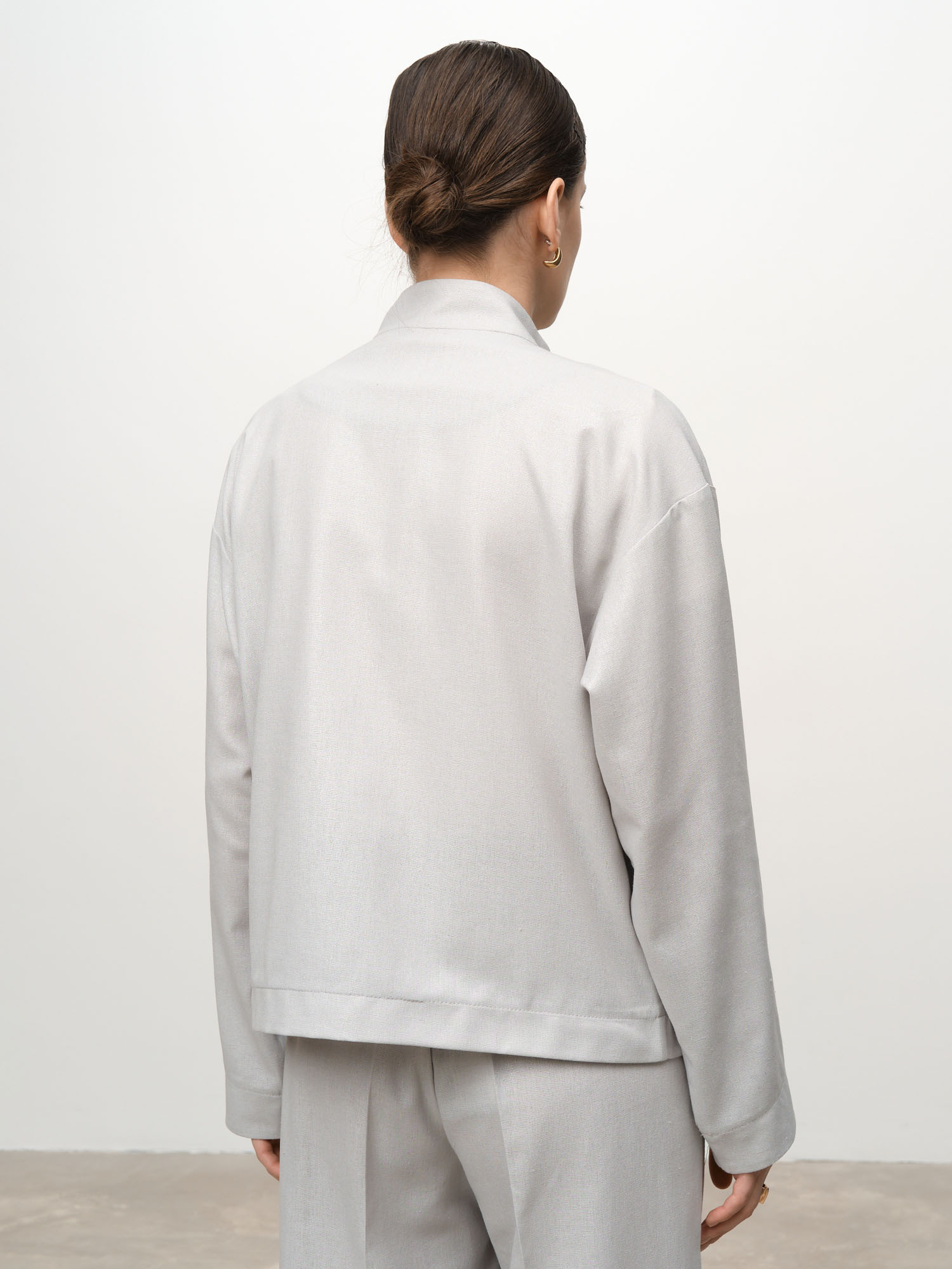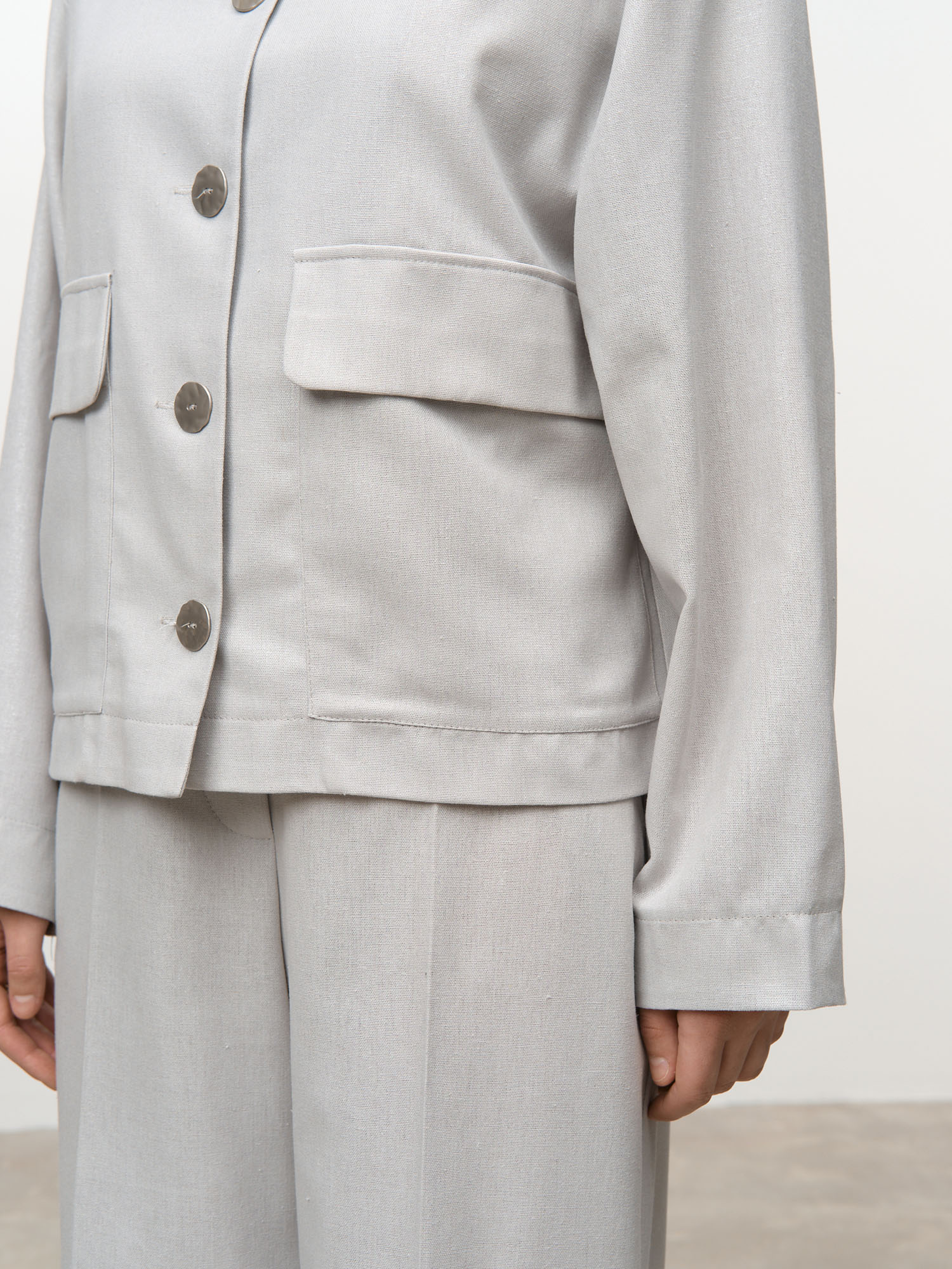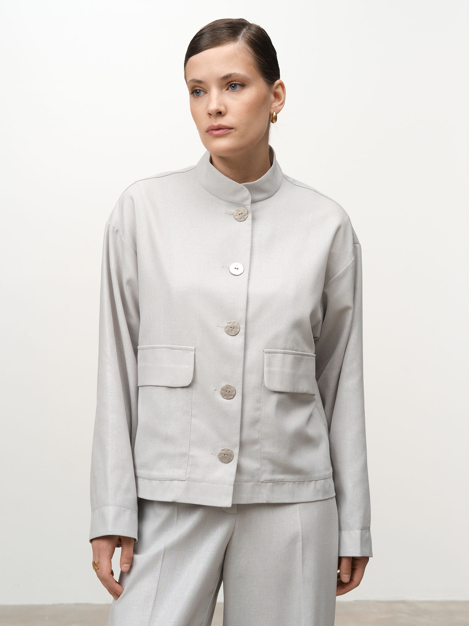 Застежка на пуговицы, накладные карманы, воротник-стойка, аккуратная обработка швов, легкая текстура ткани.