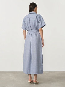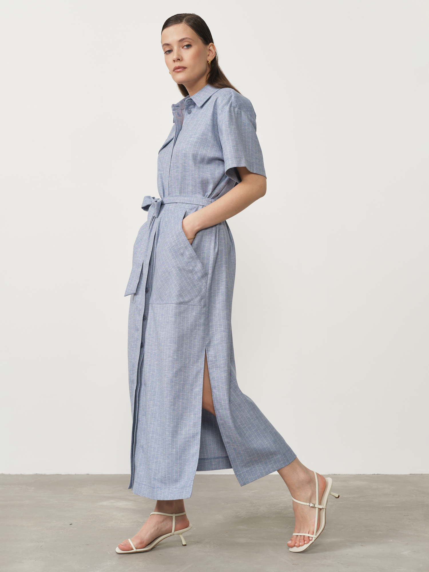 Прямой силуэт с мягким акцентом на талии. Верх выполнен в рубашечном стиле с воротником и застёжкой, что придаёт образу аккуратность и структуру.