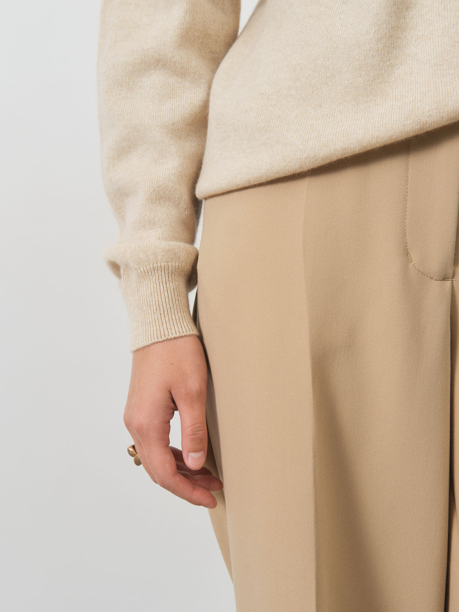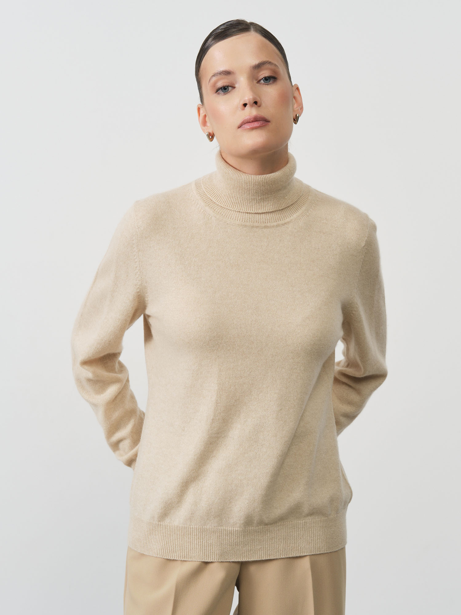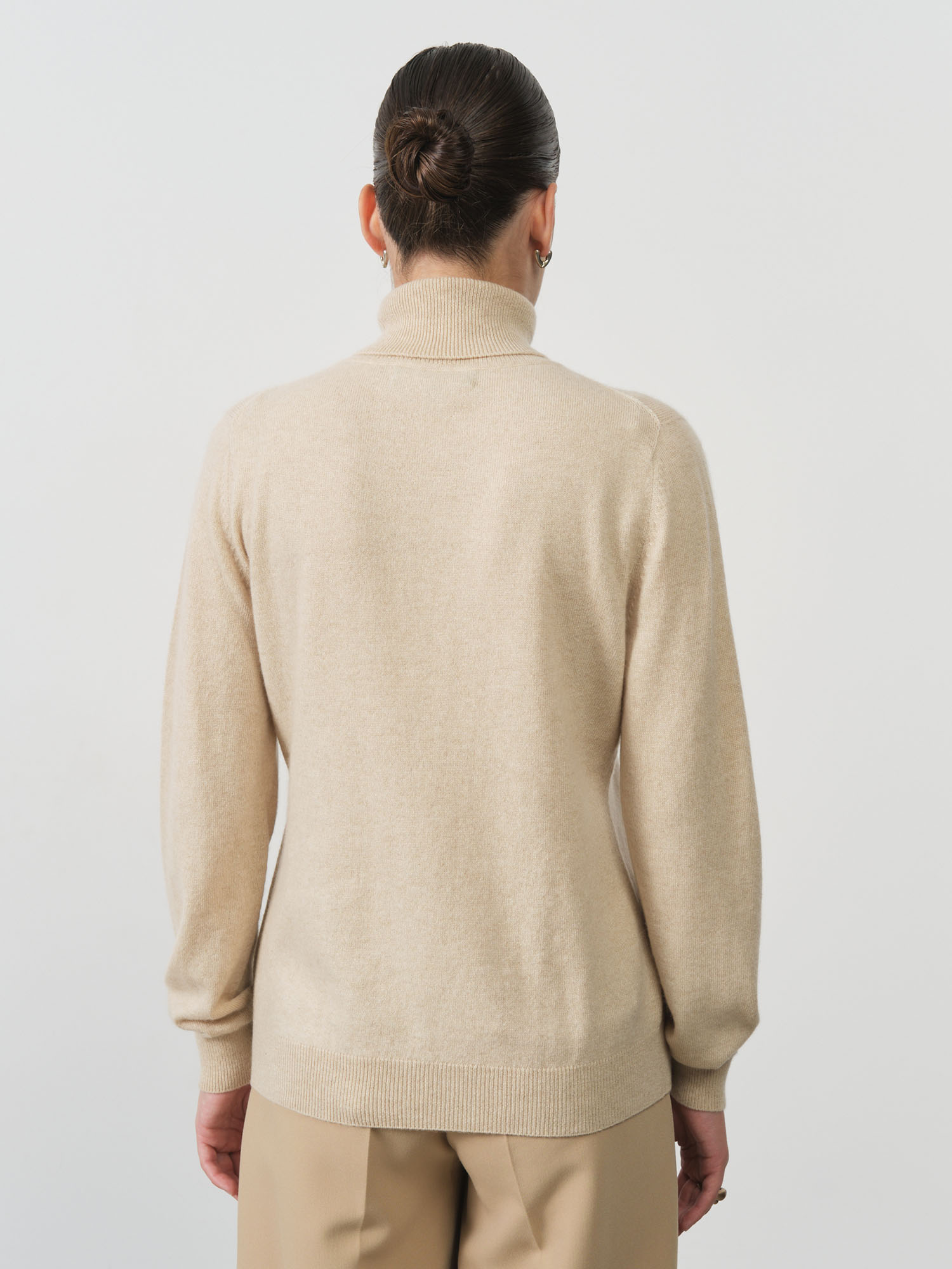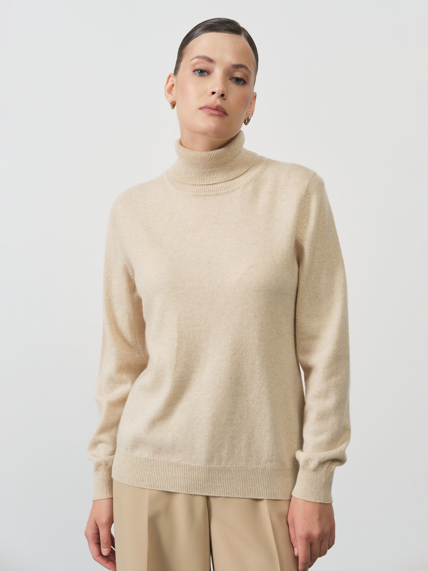Высокий воротник для дополнительного тепла, аккуратная трикотажная отделка манжет и нижнего края изделия. Ровная вязка подчёркивает качество кашемира и помогает изделию сохранять форму.