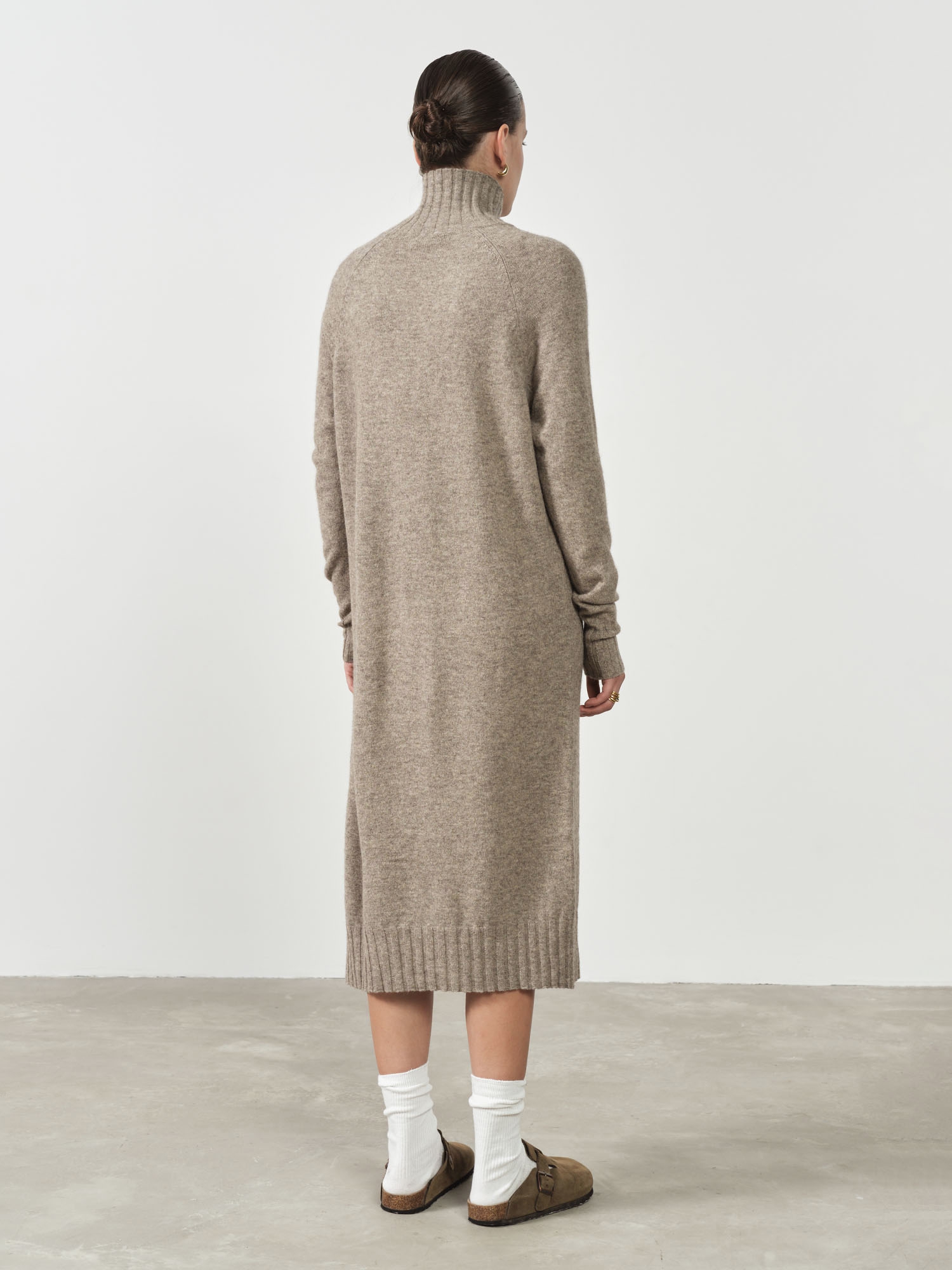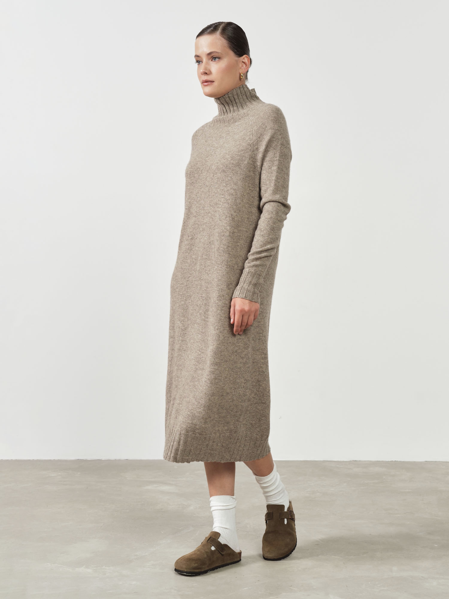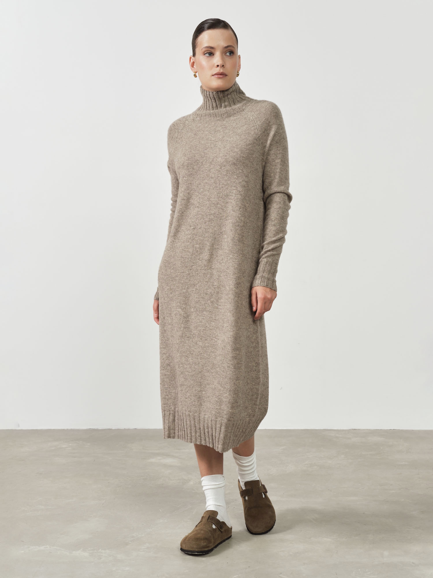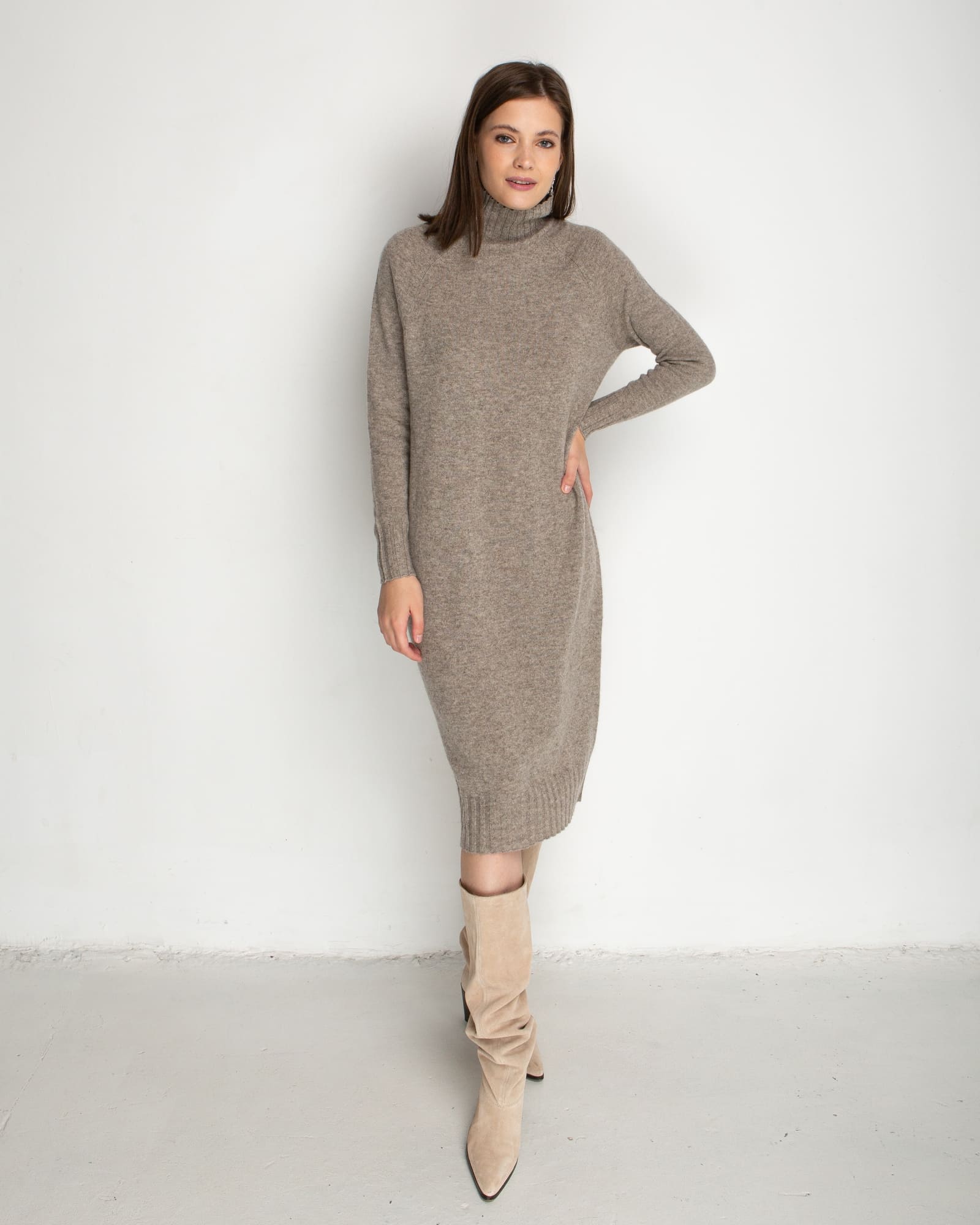 Платье из пуха яка — элегантная и уютная модель, идеально подходящая для холодного сезона. Удлинённый силуэт и мягкая фактура создают сдержанный, но выразительный образ на каждый день.