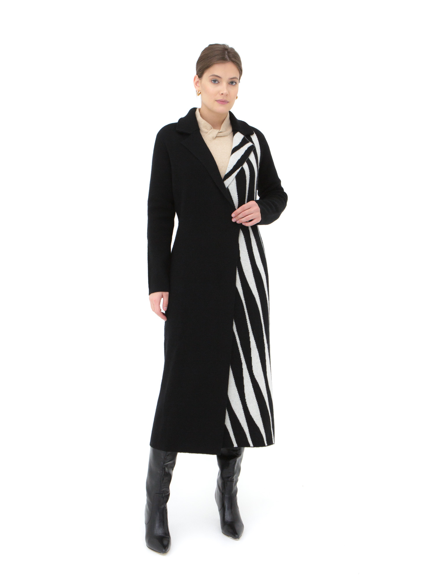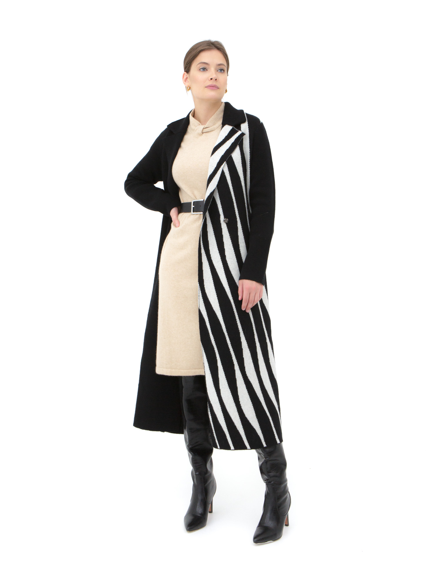 Элегантный удлинённый кардиган, сочетающий в себе благородство кашемира и тепло пуха яка. Модель выполнена в чёрном цвете с контрастным графичным узором, который придаёт образу выразительность и современный характер. Идеально подходит для многослойных образов и акцентных выходов.